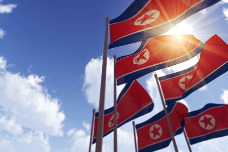 North Korea flags waving in the wind against a blue sky. 3D Rendering