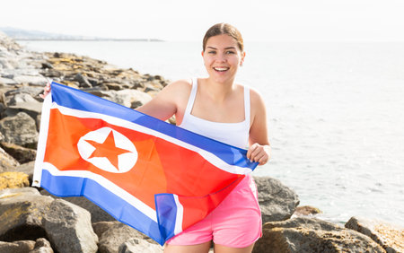 National flag of North korea. Beautiful woman with North korea flag on beach.