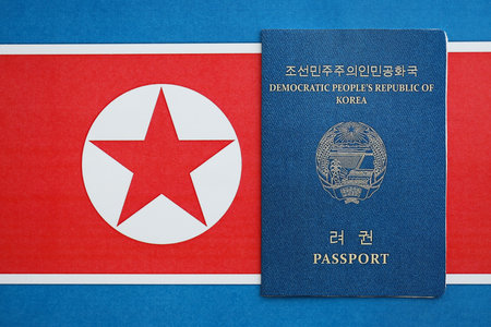 North Korean passport lies on People Republic of Korea flag close up. Travel and citizenship concept