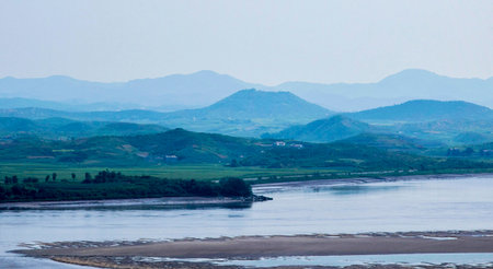 Dongy, North Korea - May 1, 2019: DPRK and Taedong River at sunset time.