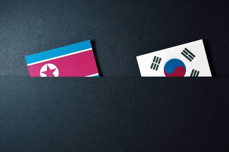 Concept of bilateral relations of USA and North Korea showing with flag and summit in wooden block letters.
