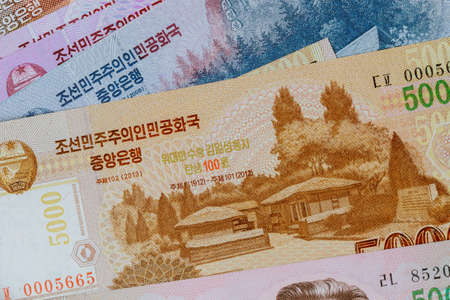 North Korean won money bills in big amount lies on People Republic of Korea flag close up. Finance and banking concept