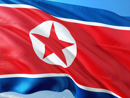 Flag of North Korea waving in the wind against deep blue sky. High quality fabric.