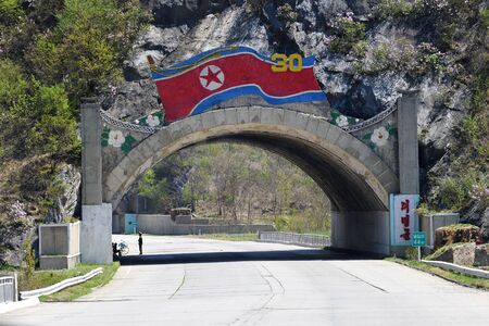 North Korea - May 3, 2019: Roads of North Korea. A short tunnel in the mountains decorated with the national flag