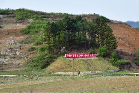 Countryside landscape, North Korea. Cultivated agricultural field, orchard, dirt road and propaganda banner at hill