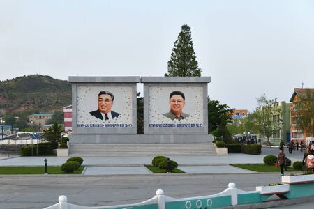 Wonsan, North Korea - May 4, 2019: Propaganda banner with portraits of former leaders in Wonsan, one of the North Korean port on the Eastern seashore