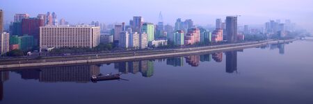 Pyongyang, North Korea - April 30, 2019: Skyline and Taedong River in the morning fog. View on modern residential complex on the Othat Kangan street from the Yanggakdo island