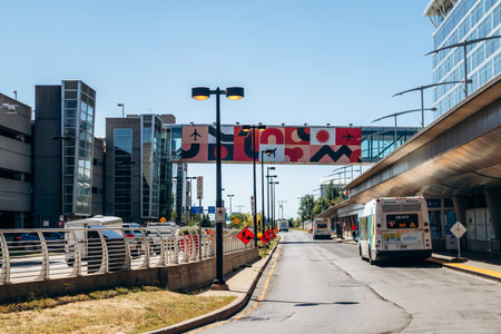 Montreal, Canada - August 15, 2025: Exterior roadway and terminal buildings at the airport on a clear summer day