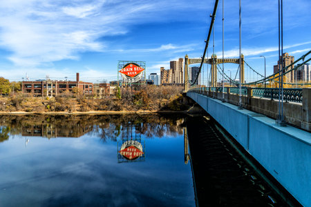 Minneapolis, Minnesota - October 31, 2022: Grain Belt Beer sign over Nicollet Island in downtown Minneapolis. Grain Belt beer is brewed in the state of Minnesota by the August Schell Brewing Company.