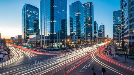 Evening urban scene featuring illuminated skyscrapers and dynamic motion blur from vehicle lights, ideal for business, travel, and technology themes