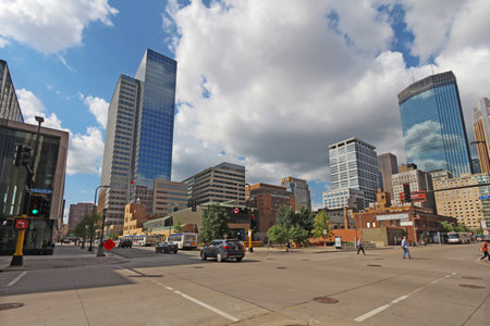 MINNEAPOLIS, MINNESOTA - AUGUST 11 2014: Pedestrian and car traffic moves through downtown Minneapolis, the seat of Hennepin County and the largest city in Minnesota with over 400,000 residents.
