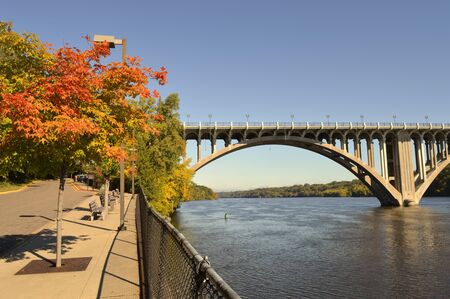 MINNEAPOLIS, MINNESOTA - OCTOBER 10, 2015: Walking the Stone Arch Bridge over the Mississippi River on Saturday evening