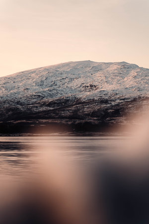 Sunset sky over snowy arctic mountain next to fjord in Tromso, Norway