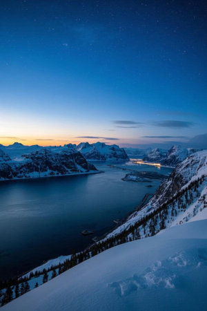 A serene winter vista of snow-covered mountains and a calm fjord, with a small village visible in the distance.