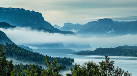 A mystical fjord in Norway with mountains and fog hanging over the water in polar day. midnight sun, selective focus