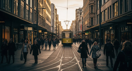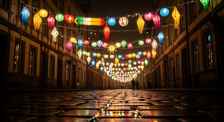 Flensburg, Germany - 21. December 2025: People walking on a busy Flensburg street decorated with festive lights during winter
