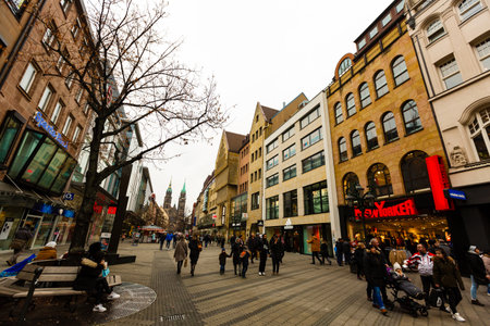 city and shopping streets around October 25, 2018 Dusseldorf, Germany. The theme of shopping in Europe. Central street with shops in Dusseldorf.