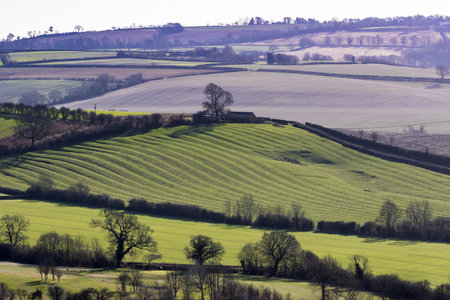 English countryside with low sun showing medieval ridge and furrow field system on a bright winters day