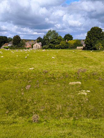 Sheep peacefully grazing on the pasture at Burrow Mump in Somerset