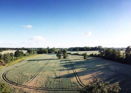 Aerial Drone shot with sunset in The United Kingdom. Agricultural field in Kent.