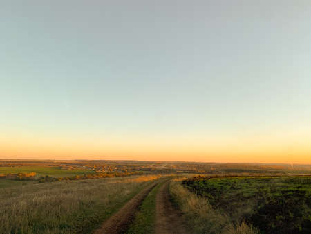 Top view of a sunset or sunrise in an agricultural field with ears of young golden rye on a sunny day. Rural landscape.