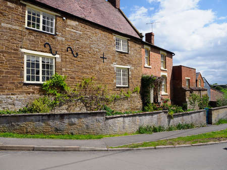 Broadway, UK - July 07, 2020: Facade and front garden of a traditional limestone house in Broadway, a large historic village within the Cotswolds in the county of Worcestershire, England.
