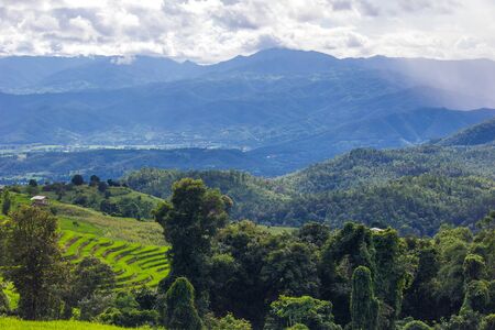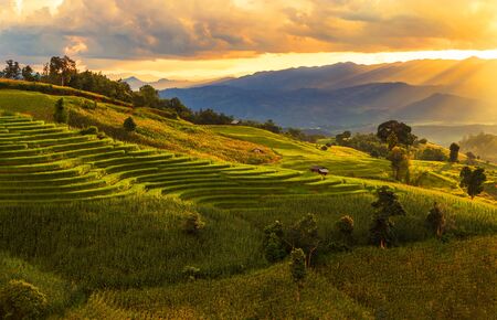 Landscape view sunset time with sun ray at green terraced plantation paddy rice field in Pa bong Pieng , Mae Chaem, Chiang Mai, Thailand