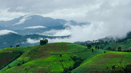 Landscape of the mountains and field with fog on sunrise in Thailand