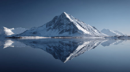 Stunning view of a majestic snowy mountain reflecting on a calm lake, capturing the serene beauty of winter landscape and tranquil nature elements.