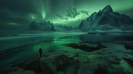 Swirling aurora borealis above frosty mountain peaks creates a breathtaking nocturnal landscape in the polar region