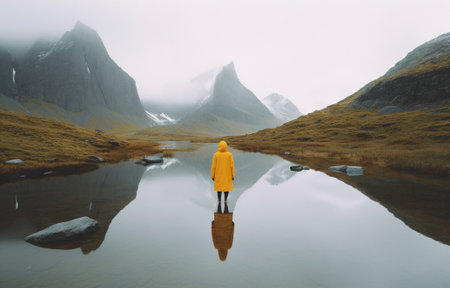 man mountain yellow hiking water nature cape lake concept travel back background. Generative AI.