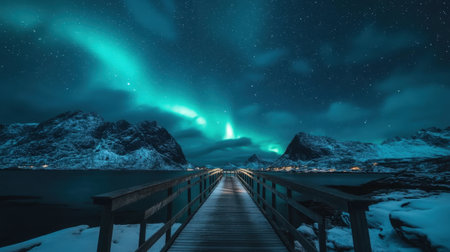Experience the enchanting beauty of the Aurora Borealis illuminating a serene mountain landscape, captured from a wooden pier under a starry night sky, highlighting nature