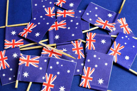 Australian flags background, with red white and blue Southern Cross flags against a dark blue background.