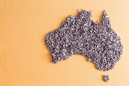 Conceptual map of Australia formed of small silvery stones on a yellow textile with weave detail and copyspace