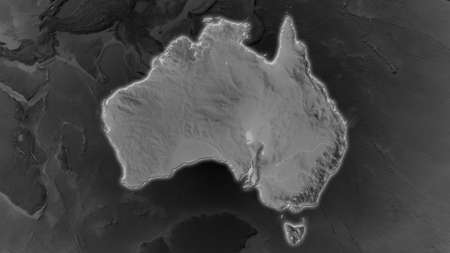 Australia area enlarged and glowed on a darkened background of its surroundings. Grayscale bumped elevation map