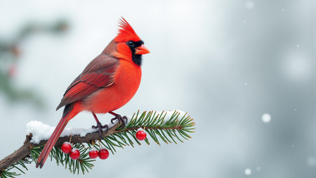 A vibrant red cardinal sits gracefully on a snow-covered pine branch, surrounded by a serene winter landscape. Plump red berries add a splash of color to the tranquil scene.