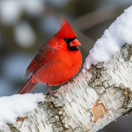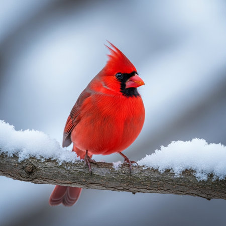 A striking male cardinal with vibrant red plumage sits on a snow-covered branch, its sharp beak and crest clearly visible against a soft, blurred winter...