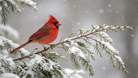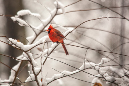 A vibrant cardinal perched on a snow covered branch during a winter snowfall. A beautiful nature scene of winter wildlife. So peaceful and serene.