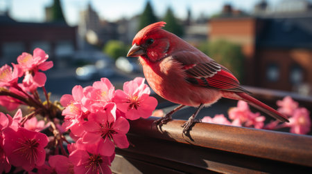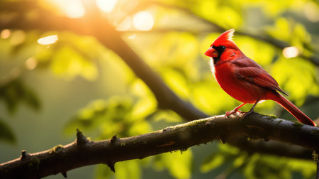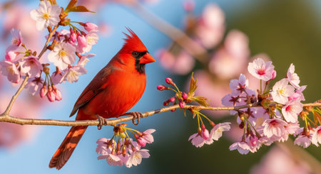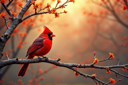 Vibrant red cardinal perched on blossoming branch at sunrise. That the image is generated using AI.