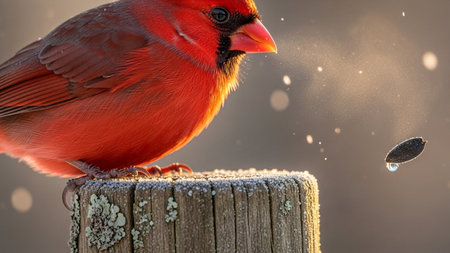 Bright northern cardinal perched on wooden post covered in frost with sunflower seed falling. Winter birding scenic wildlife photography
