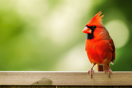 A striking red cardinal stands confidently on a wooden railing showcasing its bright plumage against a blurred backdrop of vibrant green foliage. The birds distinctive orange beak and black facial markings are clearly visible highlighting its beauty