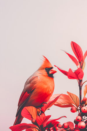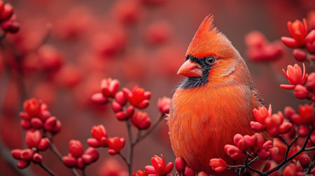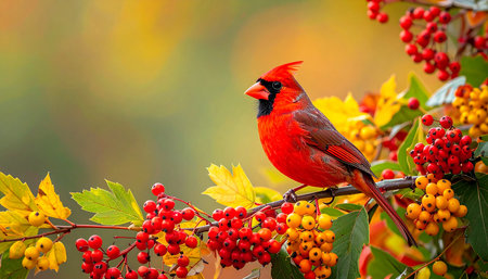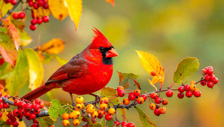 Vibrant cardinal perched on berry-laden branch at sunset glow. That the image is generated using AI.