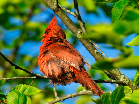 A bright red northern cardinal perched on a tree