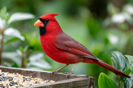 Beautiful male Northern Cardinal perched on a wooden bird feeder enjoying some birdseed