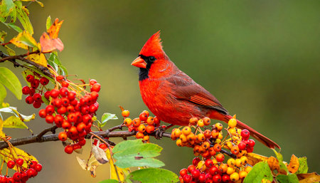 Male Northern Cardinal (cardinalis cardinalis) perched on a rowan berry in autumn