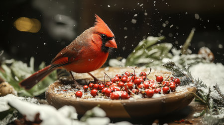 A vibrant cardinal perches on a dish of berries, surrounded by snow and greenery, creating a picturesque winter scene.