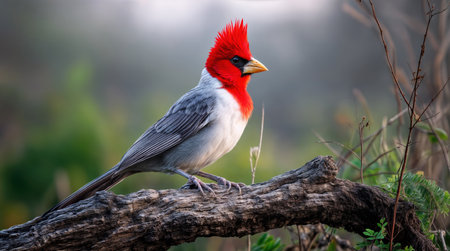 A Red-crested Cardinal Paroaria coronata perched on a branch in a lush green forest, surrounded by soft light and vibrant foliage, showcasing its bright red crest, grey back, and white underparts in its natural habitat.