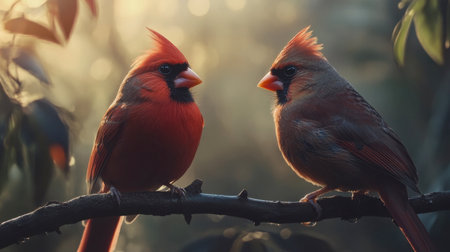 Two vibrant red cardinals sit closely on a branch, surrounded by soft morning light, creating a serene and tranquil atmosphere in nature.