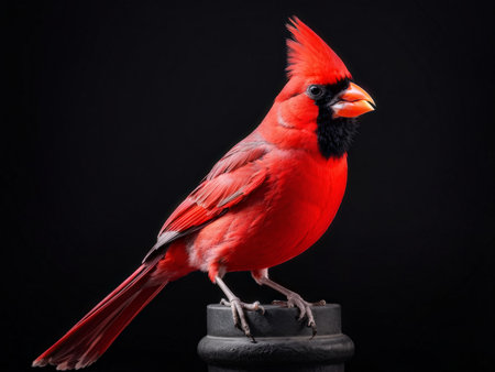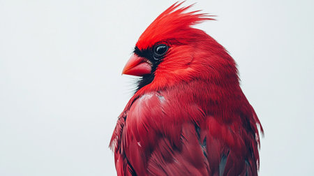 Vibrant red male northern cardinal bird, a symbol of beauty and winter, perched on a white branch. its vivid feathers and sharp features stand out clearly.