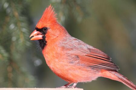 Male Northern Cardinal (cardinalis cardinalis) on a feeder with pine branches in the background